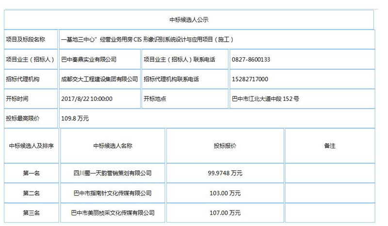 2017年8月29日上午10:00,在成都交大工程建設集團有限公示六分公司會(huì )議室對一基地三中心”經(jīng)營(yíng)業(yè)務(wù)用房CIS形象識別系統設計與應用項目(施工)進(jìn)行了邀請招標,現予以公示: